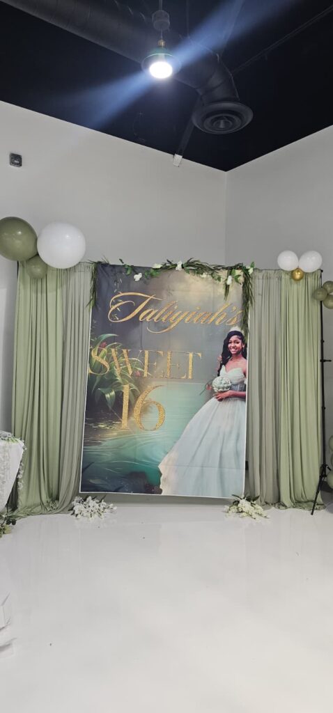 We had the honour of hosting Taliyiah’s unforgettable Sweet 16 at The Ace Event Venue—a night filled with elegance, joy, and stunning decor. The custom backdrop featured soft green draping, lush floral arrangements, and a personalised banner that captured the essence of this milestone moment. From the glossy white floors to the graceful balloon accents, every detail reflected Taliyiah’s unique style and the luxury experience we’re proud to deliver.